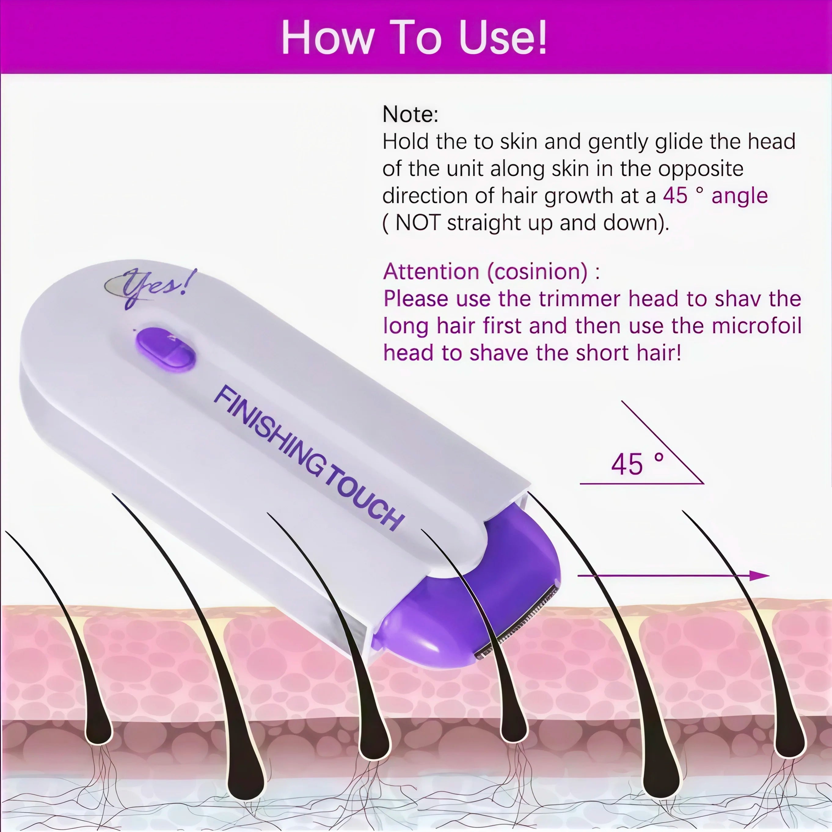 Turn on the trimmer and glide it gently over the skin in the direction of hair growth.